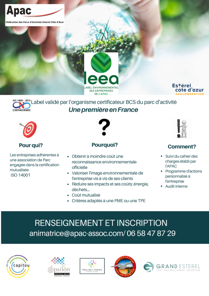 L’APAC a mis en place un système mutualisé de management environnemental et énergie, première nationale , ce qui lui a permis d’obtenir la certification ISO 14001  et ceux pour 5 parcs adhérents : EPSILON 1 à Saint-Raphaël, GRAND ESTEREL à Puget sur Argens,  PARCS DES 4 CHEMINS à Roquebrune sur Argens, CAPITOU et LA PALUD à Fréjus.